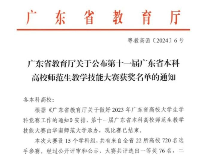 2023年9月24日,由广东省教育厅主办、华南师范大学承办的第十一届广东省本科高校师范生教学技能大赛(小学教育组)决赛在华南师范大学石牌校区举行。经过校内初赛(2022-2023学年第一学期小学教育专业2021级师范生教师职业能力大赛)推选和省赛组委会初选后,我院两名参赛选手:朱琳(指导教师:潘昕迪、魏林苹)和程琳(指导教师:赵中宝)代表学校入围决赛圈,并获得了三等奖的好成绩。首次参赛即获奖,这与我院在人才培养、...