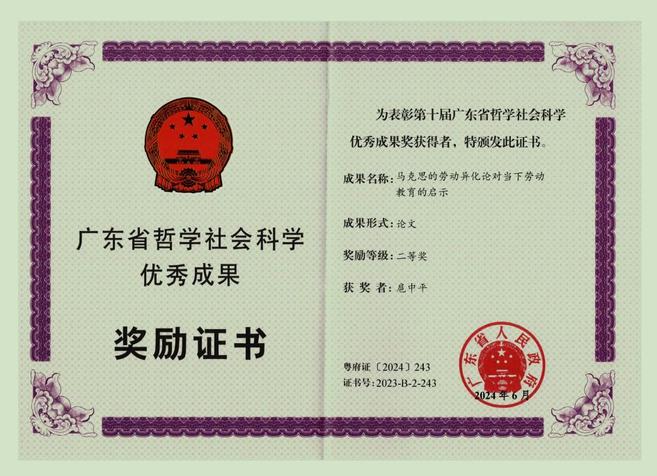 近日,第十届广东省哲学社会科学优秀成果奖获奖名单公布,我院扈中平教授凭借其在《教育研究》期刊发表的学术论文《马克思的劳动异化论对当下劳动教育的启示》荣获二等奖。