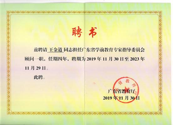 2019年11月30日,广东省学前教育专家指导委员会成立仪式暨学前教育研讨活动在广东省外语艺术职业学院举行。在成立仪式上,我校教师教育学院院长王金道教授被聘为“广东省学前教育专家指导委员会顾问”。