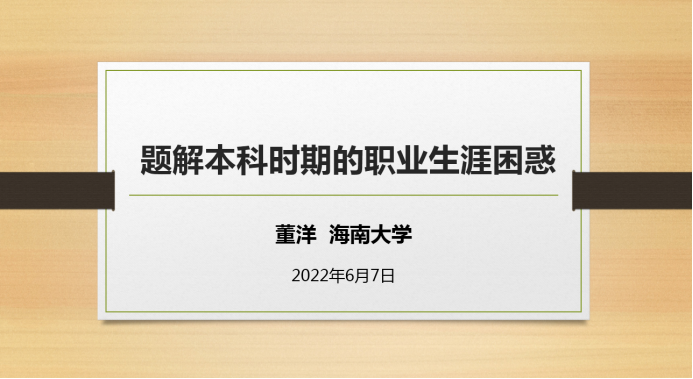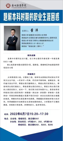 现在大学各种专业资格证考试层出不穷而又生生不息,一代学子一代神,代代学子铸考神。放眼校外,现代层出不穷那些比我们优秀的人,自身条件比我们的人都还在努力,试问,我们努力的方向是什么?是否经常在怀疑自己努力是否有用?究竟怎样的赛道才是属于我们00针对这些困惑,教师教育学院邀请到海南大学副教授,90后硕士生导师董洋老师并202267下午15:20,分别于增城校区励志楼B307(主会场)、B202B203B205四会校区62012028号楼108举办题解本科时期的职业生涯困惑论坛,让同学们拟从做题角度,例解本科生涯发展中的困惑,用解题的思路剖析努力的方向,利用破题的方法就职业生涯规划提供建议,力求置身于正确的赛道。