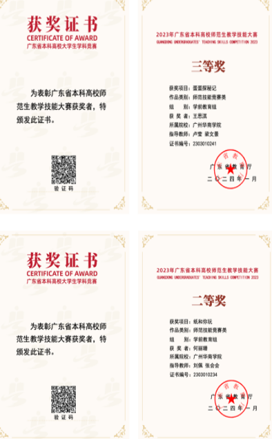 曾宛尹同学荣获广东省本科高校师范生教学技能大赛学前教育组二等奖 |