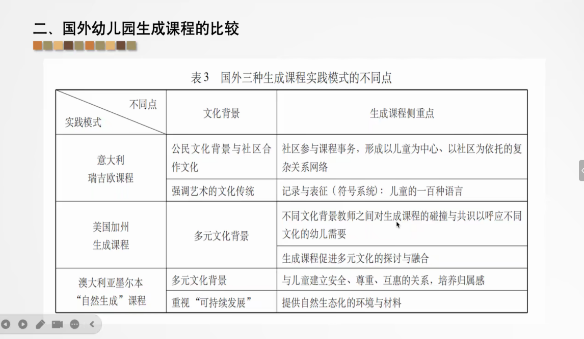 苏媛老师开篇明确了生成课程的核心要义,强调生成课程的本质是尊重儿童的主体地位。她提出,儿童并非被动接受知识的客体,而是有潜力、有能力、积极主动的沟通者和创造者。这一核心观点为整场讲座奠定了理论基础,帮助同学们重新审视儿童在课程中的角色定位,打破了对传统课程“教师主导”的固有认知。为让同学们全面理解生成课程的发展脉络与实践差异,苏媛老师聚焦国外幼儿园生成课程展开比较分析。她系统梳理了不同国家在生成课程理念、实施路径、支持体系等方面的特色,通过对比不同教育背景下的实践模式,让同学们清晰看到生成课程的多元呈现形式,同时也为国内实践提供了可借鉴的经验与思路。