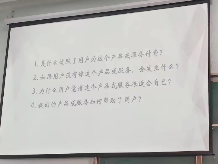 他抛出了四个问题:一是什么说服了用户为这个产品或服务付费?二是如果用户没有你这个产品或服务,会发生什么?这两个问题老师从产品的需要的本质上,辅以老人需要陪伴的银发经济和康养中心的存在价值的实例生动地进行解答。问题三是为什么用户觉得这个产品或服务适合自己?老师建议,用用户思维和换位思考去进行解决。问题四是我们的产品或服务如何帮助了用户?搞清楚自身创业公司或学校等的定位。如微信的定位是工具属性,保持不去打扰用户的定位,故在其使用页面中就不会看到广告。赵老师还提到了具有参考意义的画像方法,为后面逻辑闭环的提出做了铺垫。
