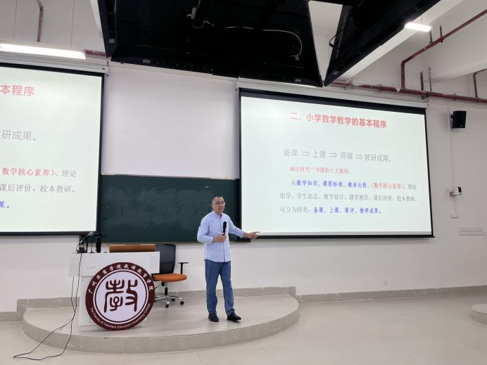 为了帮助师范生深入理解教材,掌握教材编写的理念与特点,学习如何有效地运用教材进行教学设计,并提升自身专业素养和教育教学能力,2024年5月16日至17日,广州华商学院教师教育学院在肇庆校区16号楼212举行“关于小学数学教材研究”讲座。莅临本次讲座的嘉宾有廖运章教授、王符教授和赵中宝老师,本次讲座的主讲人是廖运章教授,讲座由赵中宝老师主持,教师教育学院2022级和2023级学生参加此次讲座。
