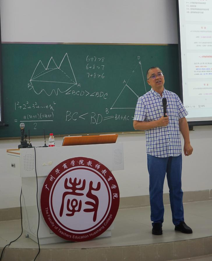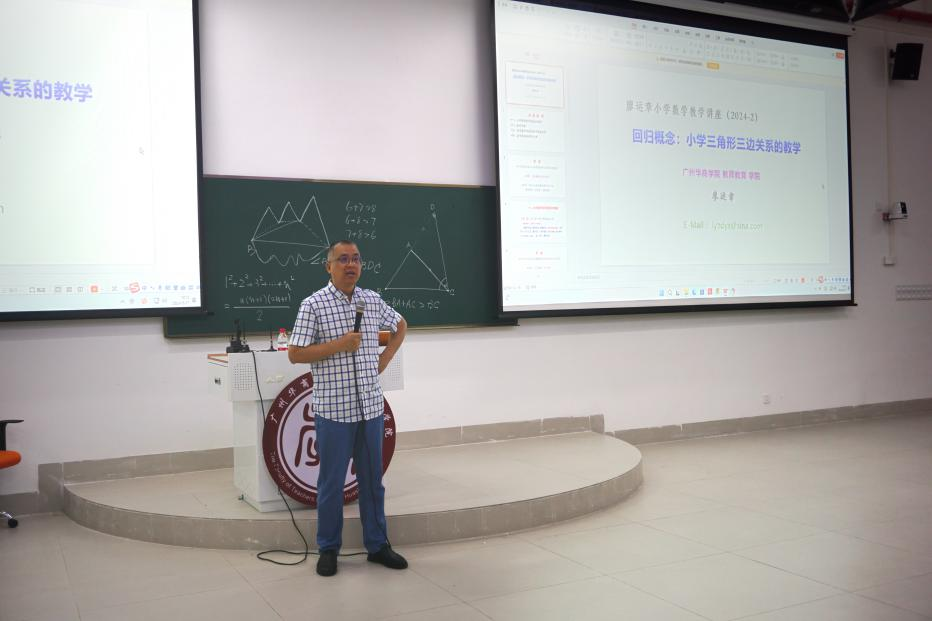 廖运章教授围绕《三角形三边关系》的课题,紧扣三角形三边的概念和三边之间的逻辑关系,讲解了如何研究教材,为上好一节课打下理论基础。