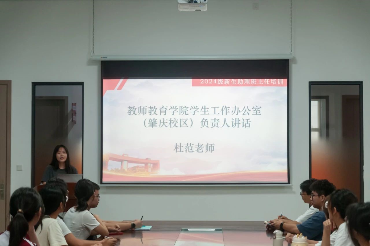 最后,教师教育学院(肇庆校区)学生工作办公室负责人杜范老师向全体助理班主任表示感谢!感谢大家对学生工作的热爱以及对迎新工作的支持。杜老师就新生助理班主任工作提出了几点要求:一是要树立责任意识,展现良好的操守和责任感;二是要规范日常行为,以身作则,树立先进榜样;三是要有团队协作精神,积极主动沟通,灵活解决问题,遇到困难问题要及时上报;四是要以饱满的热情和人文关怀投入到新生迎新工作中去。