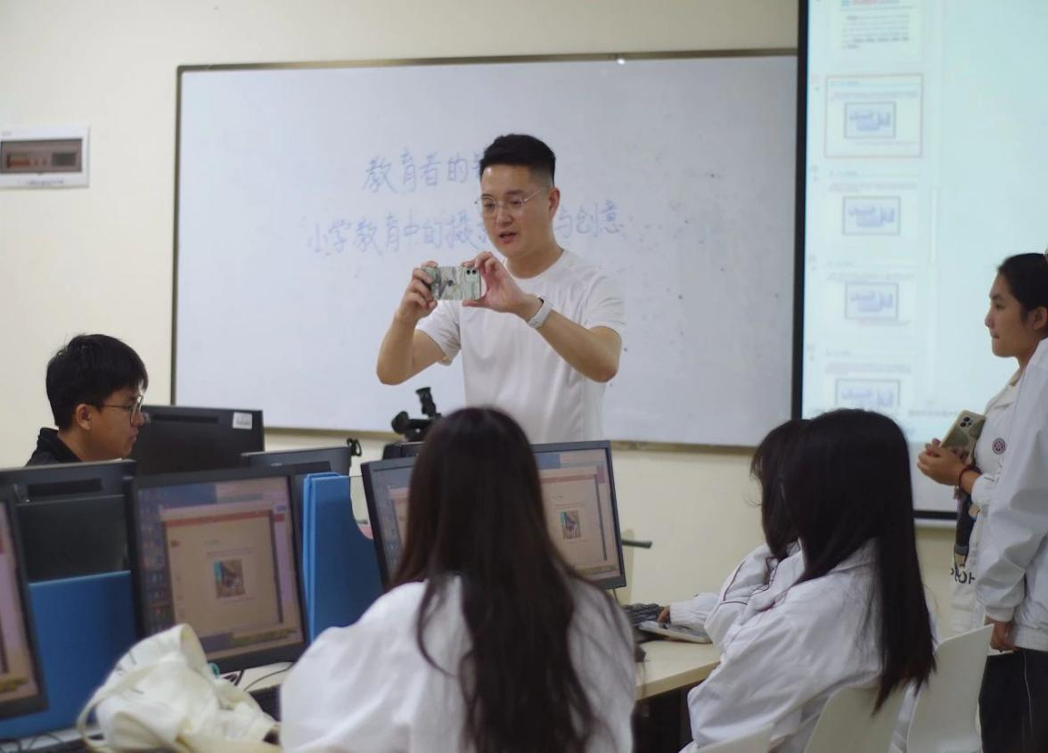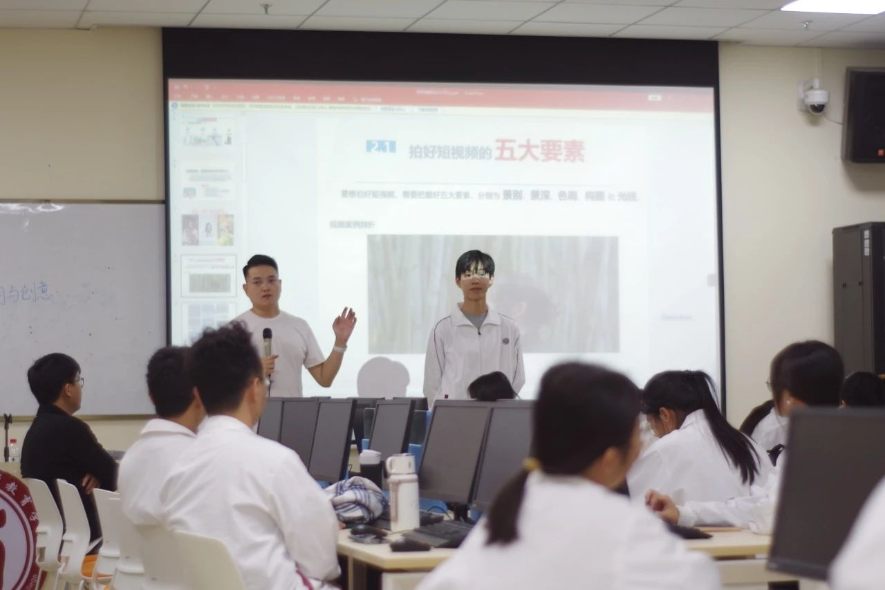 在课堂实战环节中,同学们观看完广州华商学院宣传视频后,邹老师指出其可完善之处,并亲自教授拍摄手法与姿势,将理论与实践相结合。讲解完推拉镜头效果后,邹老师邀请同学们上台体验,还详细介绍九宫格、二分/三分构图法等常用构图方式以及顺光、逆光等光源运用技巧,助力学生踏上摄影高手之路。