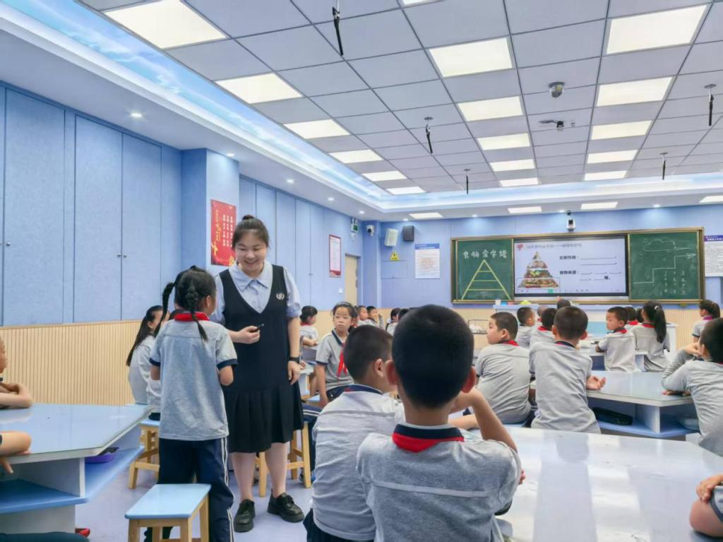 (图为跨学科学习活动展示课《Yummy food》的第一节课,《食物金字塔》的教学现场)