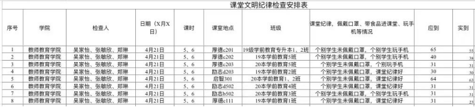 为了增强学生纪律观念,加强疫情防控意识,帮助同学们养成良好的生活习惯和学习习惯,4月份,由学工办彭博娜主任带领,教师教育学院辅导员朱娜老师和辅导员丘依欣老师,以及团学干部干事和各班班委,组成了巡查小组,对教师教育学院的课堂开展了巡查活动。