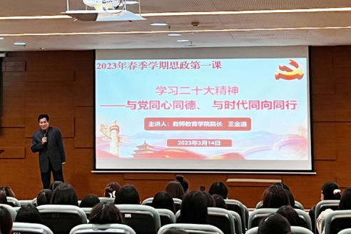 2023年3月13日,教师教育学院院长王金道教授、教师教育学院党总支书记许娜老师以“学习二十大精神”为主题为教师教育学院学生党支部党员、预备党员、发展对象以及入党积极分子进行“思政第一课”授课。教师教育学院院长王金道教授,教师教育学院党总支书记许娜老师分别从与党同心同德、与时代同向同行和树立坚定的理想信念两个方面进行授课。