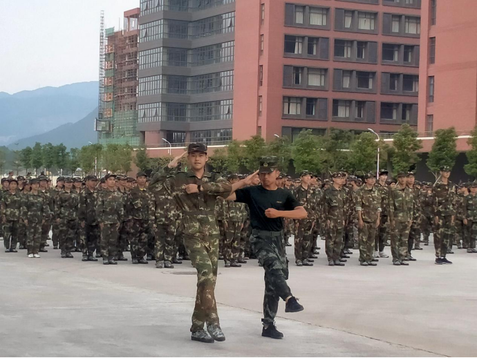同学们在骄阳下认真训练着。站军姿时纹丝不动;训练时认真听着教官的发令,做好每一个动作!