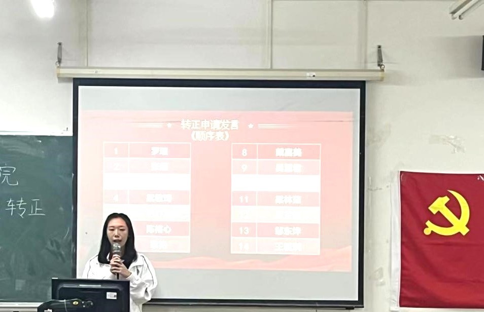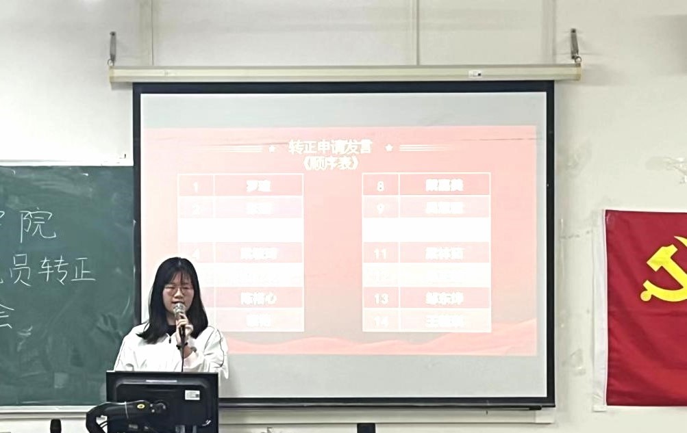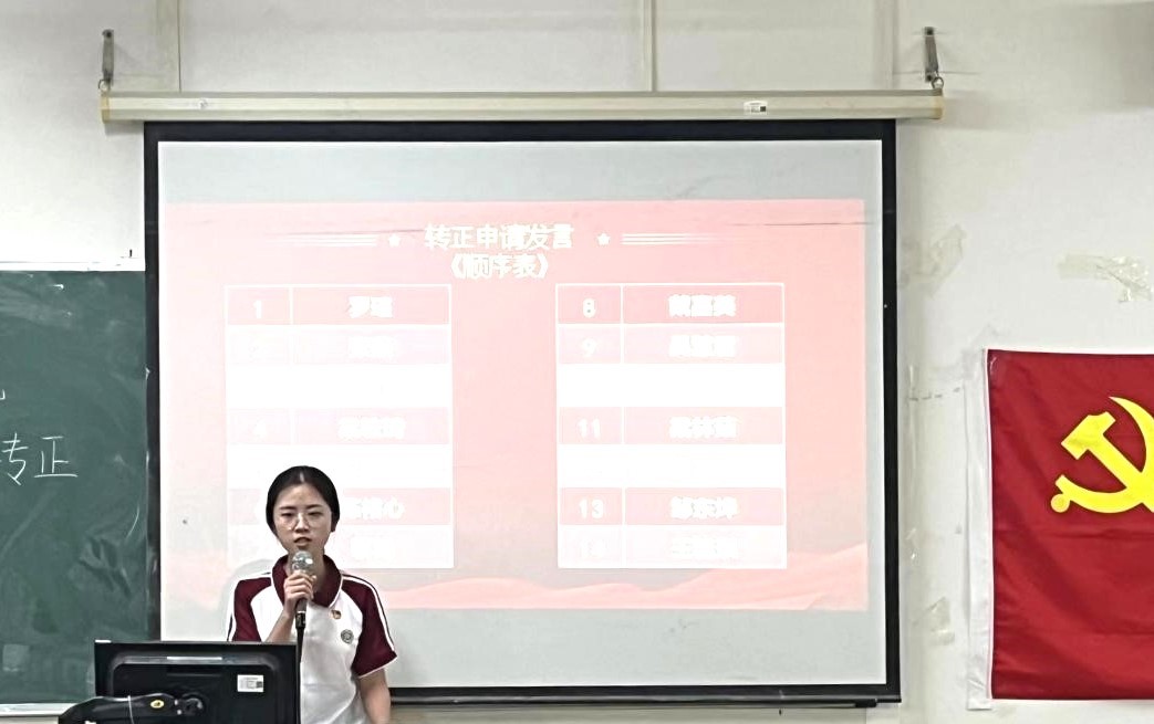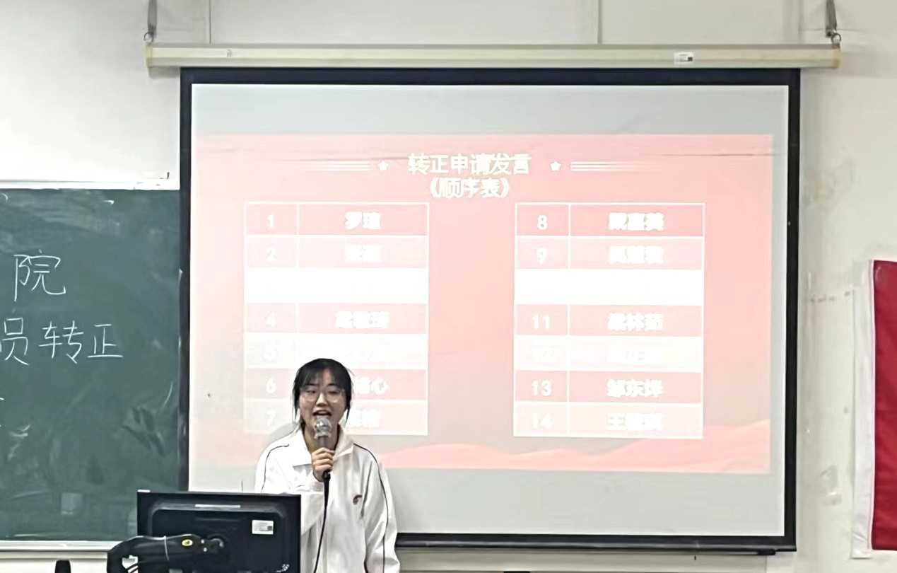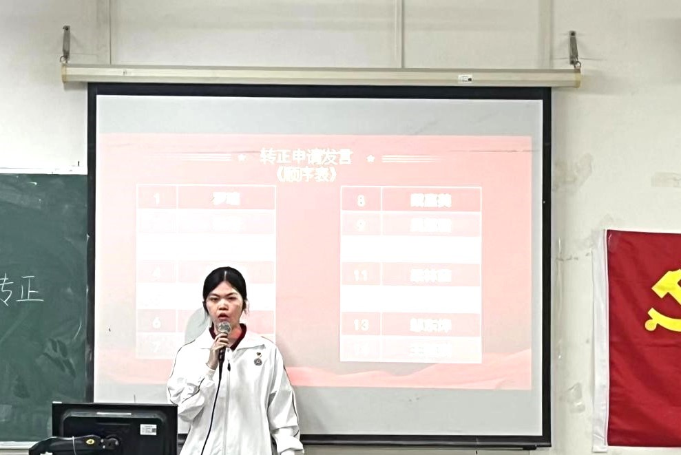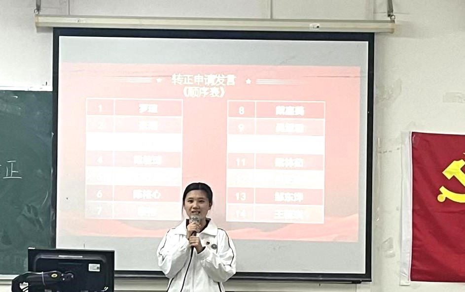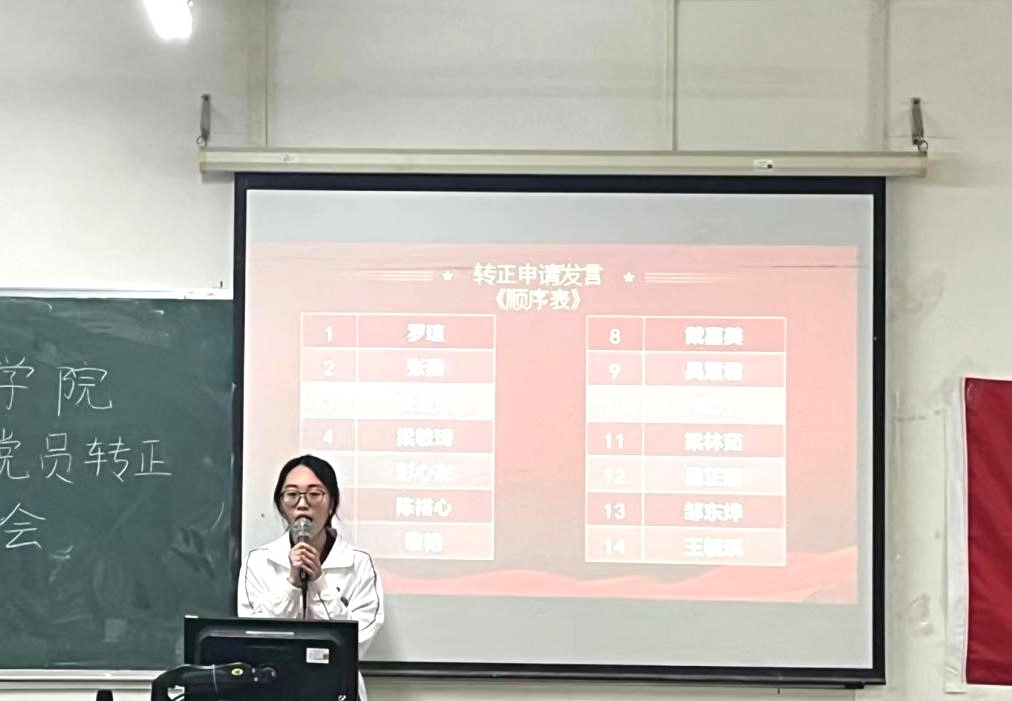本次预备党员转正申请有罗瑄、张燕、麦淑婷、梁敏琦、彭心友、陈裕心、黎艳、戴嘉美、吴慧君、梁力、梁林茹、易芷晴、邹东烨、王毓琪14名同志(以上名字排序不分先后)。大会严格按照预备党员转正的相关规定进行。