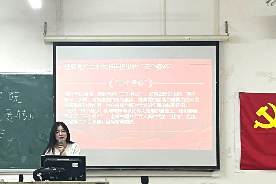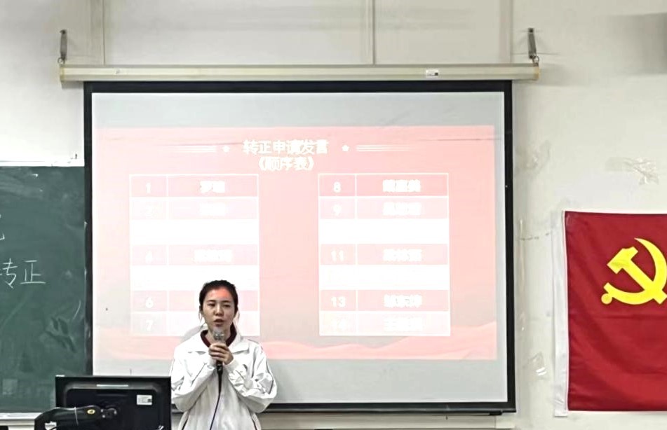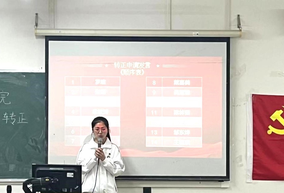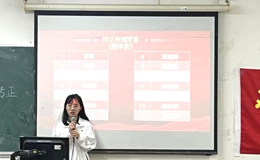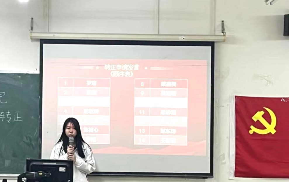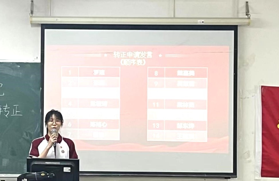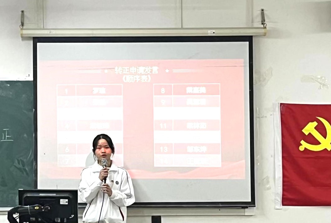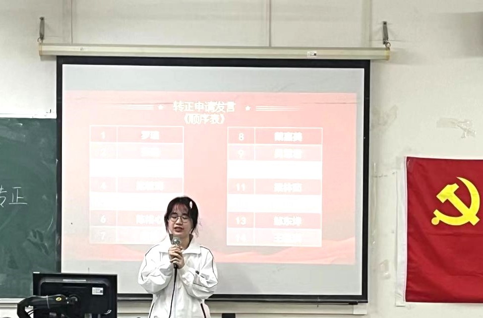 本次预备党员转正申请有罗瑄、张燕、麦淑婷、梁敏琦、彭心友、陈裕心、黎艳、戴嘉美、吴慧君、梁力、梁林茹、易芷晴、邹东烨、王毓琪14名同志(以上名字排序不分先后)。大会严格按照预备党员转正的相关规定进行。