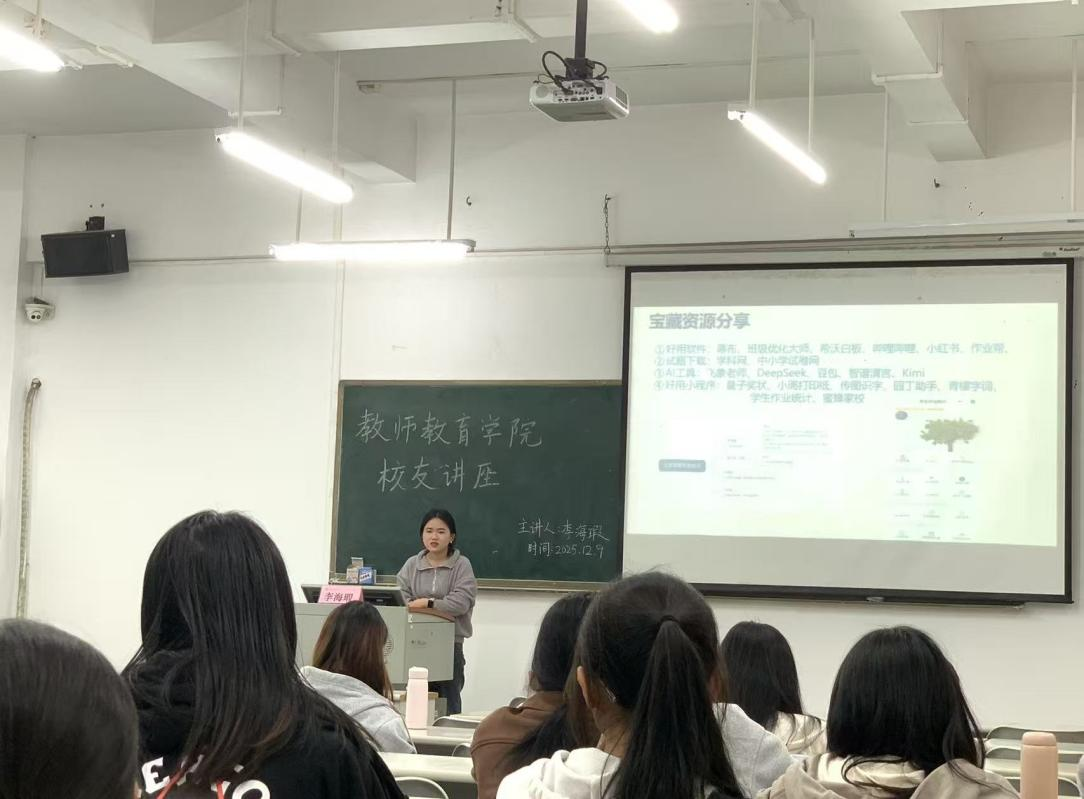 2025年12月9日,优秀毕业校友李海瑕受邀回访母校,为同教育专业的学弟学妹们开展《等枝桠,成繁花》主题讲座。本次活动以教育成长全流程为核心,通过理念阐释、实践分享、经验总结三大板块,深化对教育本质与成长规律的认知,为培养新时代教育人才提供成长指引与实践参考。
