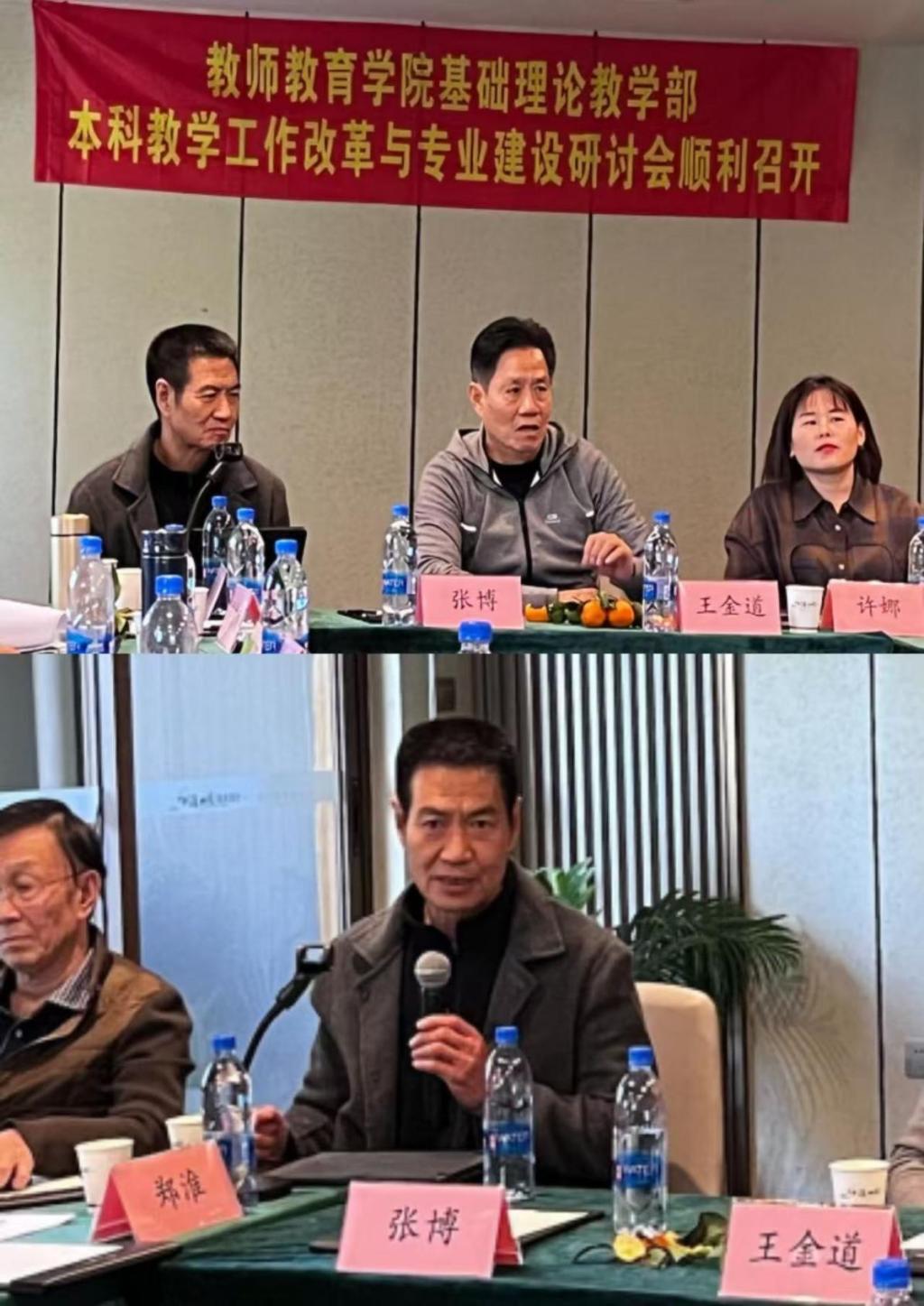 教师教育学院院长王金道教授发言,王金道院长聚焦青年教师成长,强调教学科研“两手抓”,激励青年教师积极进取,肯定基础理论教学部工作成效并寄予厚望。张博副院长表示,基础理论教学部是最有活力、战斗力最强的团队,期待基础理论教学部继续砥砺前行。随后,郑淮教授、刘宗南教授、李世平老师等相继发言,均表示在接下来的教学工作中会更注重学情分析,优化教学方法,站稳讲台、站好讲台。