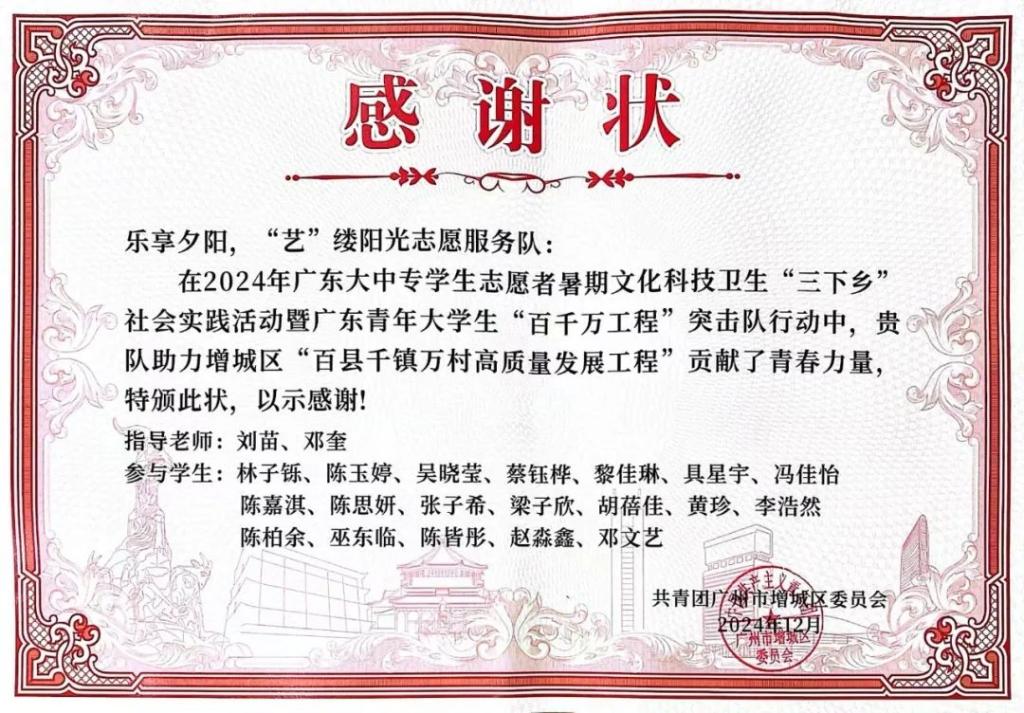 近日,广州华商学院教师教育学院组建的“星火接力,情系‘九益’”“点亮‘小楼’,暖心筑梦”“乐享夕阳,‘艺’缕阳光”三支社会实践队伍,因在增城区“百县千镇万村高质量发展工程”中的突出贡献,荣获共青团广州市增城区委员会颁发的感谢状。这是对教师教育学院践行社会责任、服务基层发展的充分肯定,彰显了华商学子在乡村振兴中的青春担当。