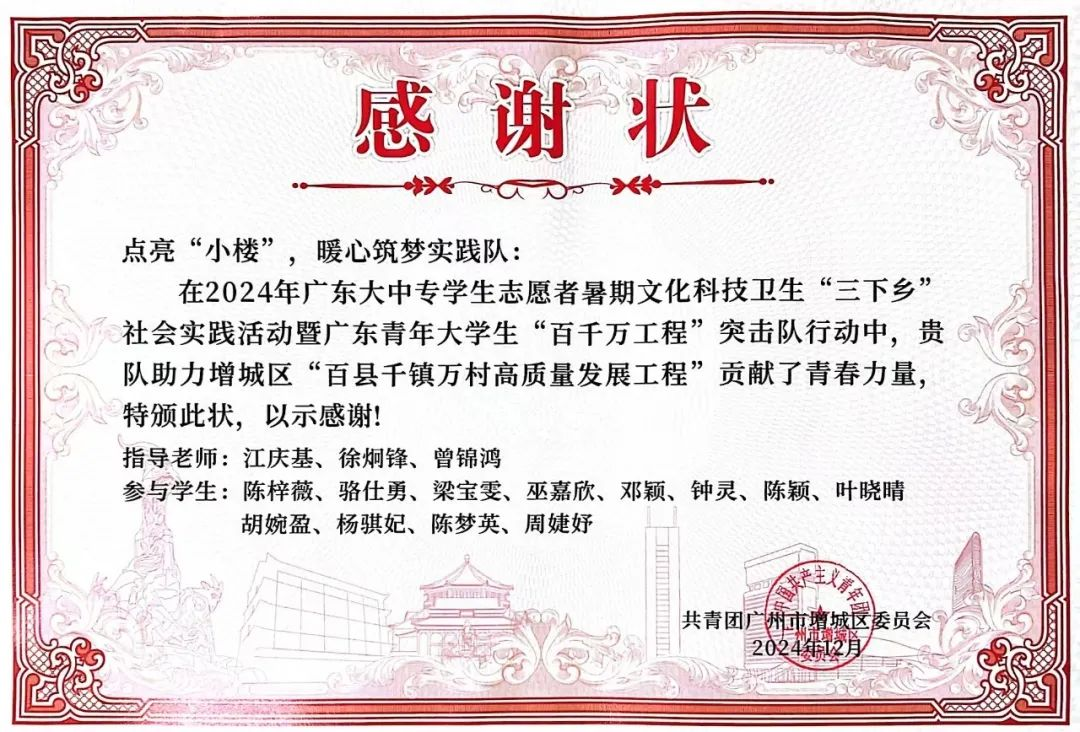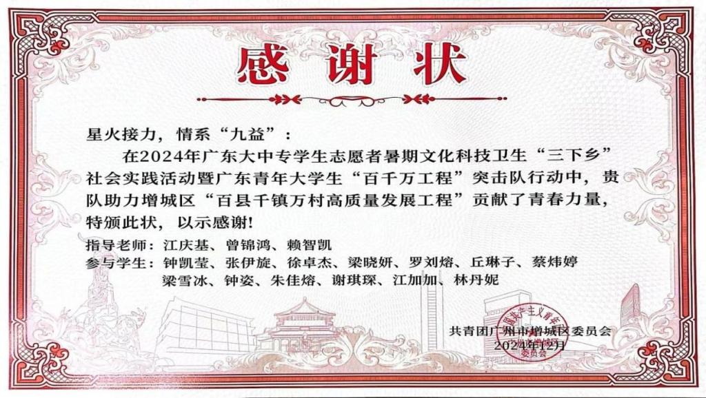 实践队员们充分发挥专业优势,将高校教育资源与基层需求紧密结合,为乡村教育注入创新活力,推动传统文化传承与社区文明建设。共青团广州市增城区委员会在表彰中高度评价:“三支队伍以实际行动诠释了新时代青年的责任与使命,为‘百千万工程’提供了生动的实践范本。”