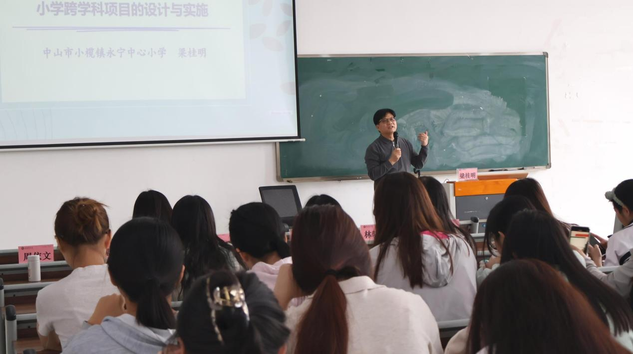 2025年4月8日下午,广州华商学院肇庆校区6号楼203、205和206教室座无虚席。中山市优秀教师、小学数学科研专家库专家梁桂明以"融创共生:小学跨学科项目设计与实施新路径"为题,为2023级小学教育专业800余名师生带来了一场教育创新的思想盛宴。