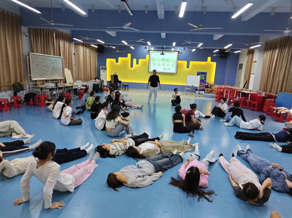 当日下午,星海音乐学院舞蹈学院副教授贾东霖以“破冰互动”开启课堂。随着老师口令,学员们迅速做出对应动作,在快节奏反应中放松身心、凝聚团队。随后,贾老师聚焦“肢体语言及形体表达”,带领学员练习四个核心舞蹈动作,从肢体控制到情绪传递,逐一纠正细节,帮助学员掌握用身体“说话”的技巧。