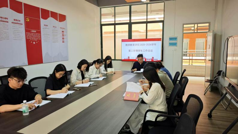 会议着重安排了教师教育学院2026年文明安全纪律教育月工作,本次教育月分工作部署、宣传动员、深化落实、迎评践规、总结表彰五个阶段推进,聚焦迎评促建核心,精准发力抓实各项工作:一、精抓学风。狠抓学风建设,全力提升课堂出勤率、前排就座率、抬头率,全面推行手机入袋,打造“两无三高”课堂;二、严整文明。深化文明纪律整治,纠治校园不文明行为,严查宿舍安全隐患,推动“五文明”成常态;三、厚植师范。彰显师范特色,将三字一话、微格教学、师德养成融入活动,锤炼师范生专业素养;四、抓实安全。开展多维度安全专题教育,筑牢师生安全防线;五、精准帮扶。落实朋辈精准帮扶,实现迎评知识全覆盖,树立全院主人翁意识。此外,会议还对学生的安全、心理健康、就业指导与服务等方面进行了全面部署。