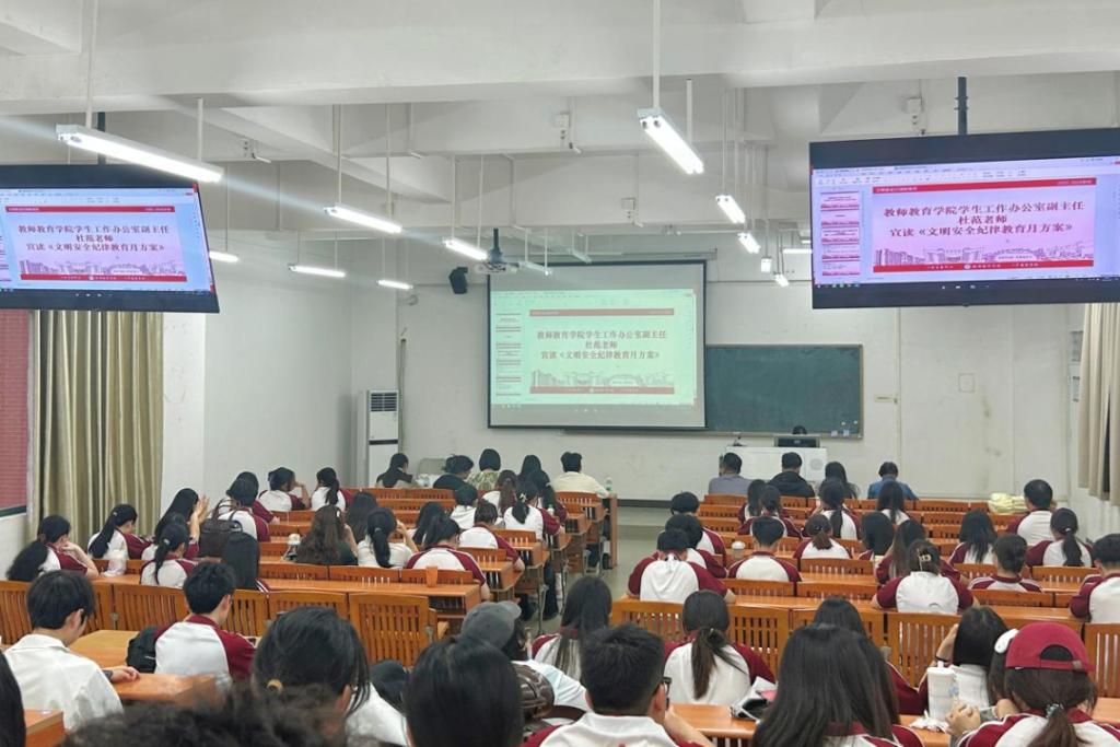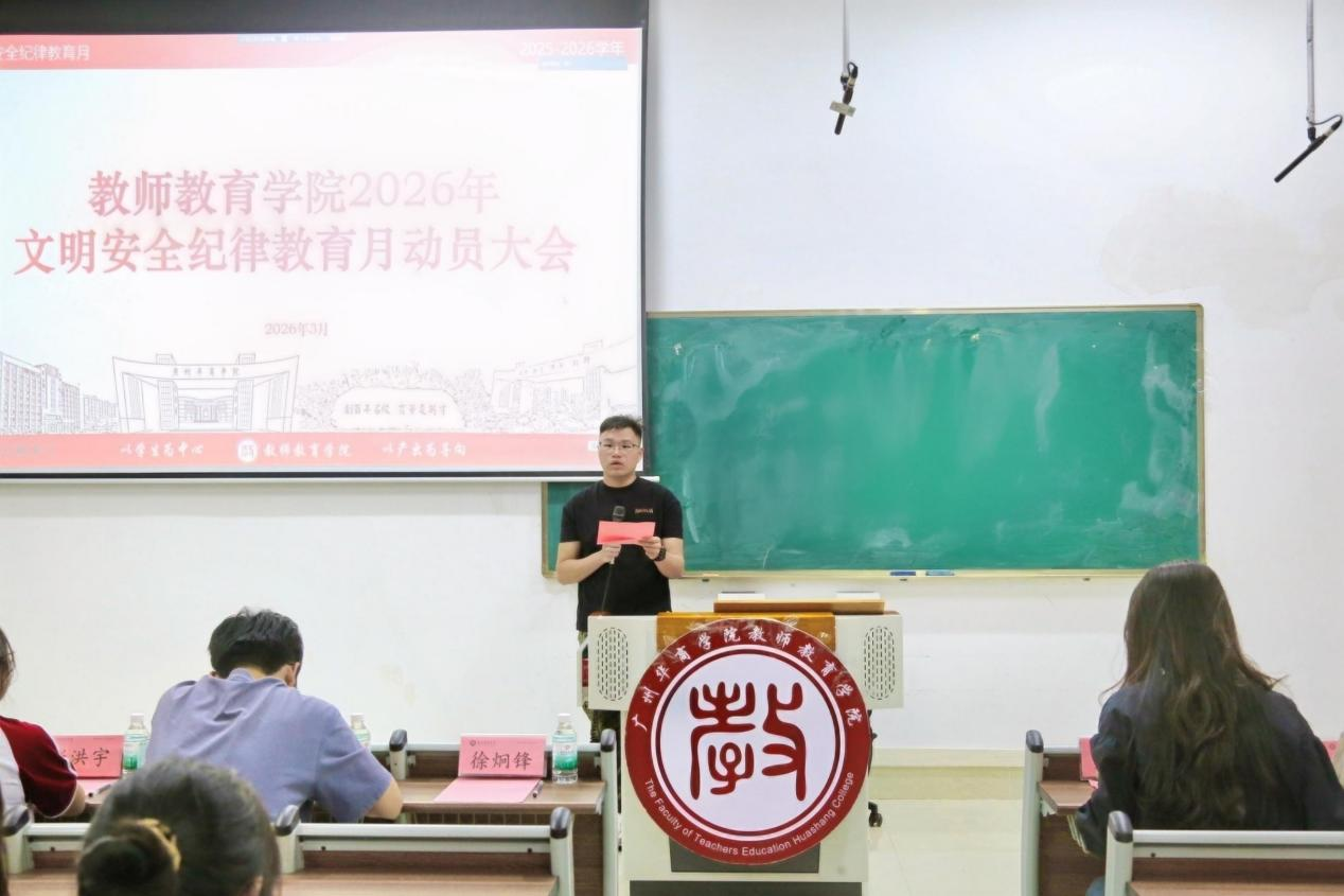 为深入推进文明安全纪律教育月活动,进一步强化组织管理与班级建设,提升全体学生的纪律意识,教师教育学院于2026年3月26日下午17:50在广州校区励志楼B402和肇庆校区6号楼207两校区同步召开文明安全纪律教育月动员大会。参与人员包括学院学生工作办公室主任江庆基、副主任杜范,学院两校区全体辅导员,各年级班级学生代表及学生组织、社团学生代表。会议由徐炯锋老师主持。