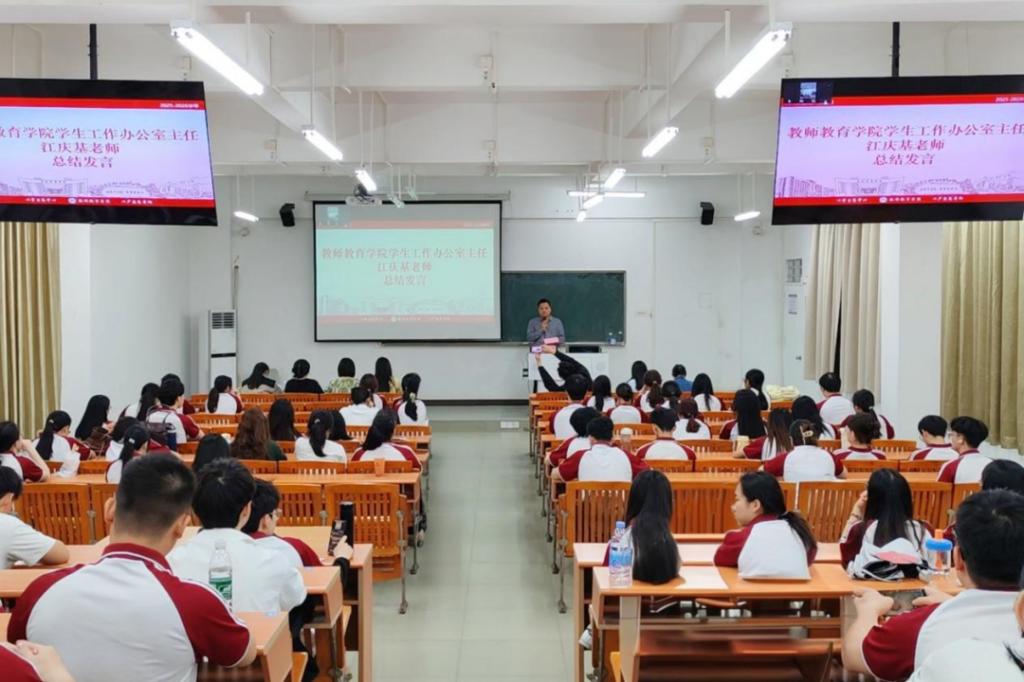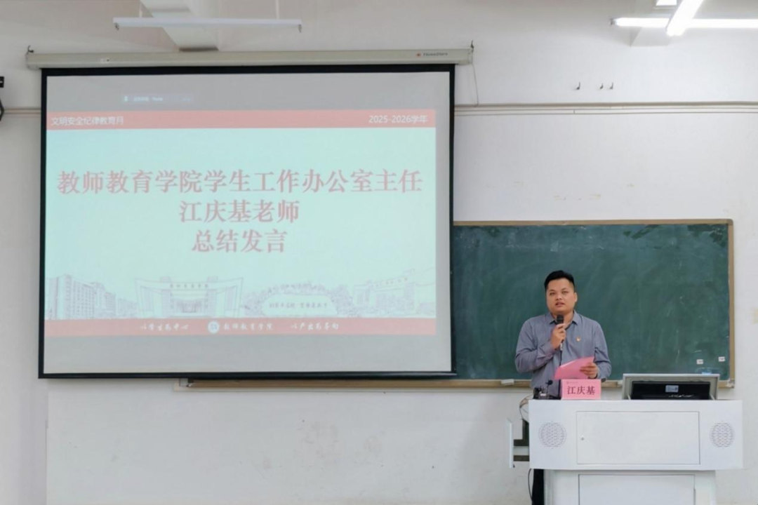接下来,江庆基主任总结强调,本次文明安全纪律教育月,是学校贯彻立德树人、紧扣本科教学工作合格评估中心任务作出的重要部署。全院师生要做到以下几点:一是提高站位,认清教育月对迎评、学风建设、彰显师范特色的重要意义;二是聚焦“五个一”任务,锚定迎评核心、提质课堂学风、守住安全底线、擦亮师范品牌、健全长效机制,明确课堂出勤率等具体要求;三是压实责任、严实作风、强化示范、协同发力,确保教育月落地见效,以优良学风等保障评估圆满成功。