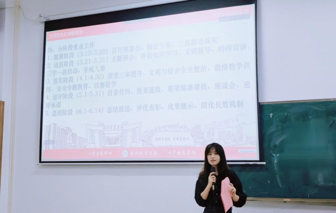 至此,相关工作部署会议圆满结束。此次会议不仅明确了文明安全纪律教育月的核心定位与工作方向,更凝聚了全体人员的思想共识、压实了工作责任,为后续文明安全纪律教育月各项工作有序推进、落地见效奠定了坚实基础,对助力本科教学工作合格评估、强化学风建设、彰显师范特色具有重要的引领和推动作用。
