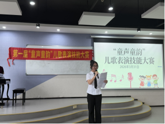 活动伊始,主持人向现场师生介绍了本次大赛的评委团——教师教育学院学前教育系专任教师魏莎、王敏,并宣读比赛规则,明确参赛作品需贴合 3-6 岁幼儿认知特点,表演时长为 3-5 分钟,将从儿歌选择与创意、演唱与表达、动作与舞台呈现等多个维度进行综合评分。魏莎老师在赛前寄语中介绍了儿歌表演技能素养对学前教育学生的重要性以及本次活动的意义,并鼓励参赛选手们以童趣之心演绎作品,将专业技能与幼儿视角相结合,在舞台上展现自我、绽放光彩。最后宣布教师教育学院学前教育专业第一届儿歌表演技能大赛正式开始。