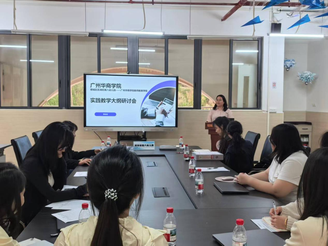 为扎实推进学前教育专业实践教学改革,提升师范生教育实习质量,近日,广州华商学院教师教育学院学前教育系与荔湖街第八幼儿园联合举办了实习大纲专题研讨活动。双方围绕当前实习工作中存在的实际问题,就下学期实习大纲的修订完善进行了深入交流与探讨。荔湖街第八幼儿园园长洪培英、广州华商学院教师教育学院学前教育系主任张建波教授及双方教师代表共同出席本次活动。