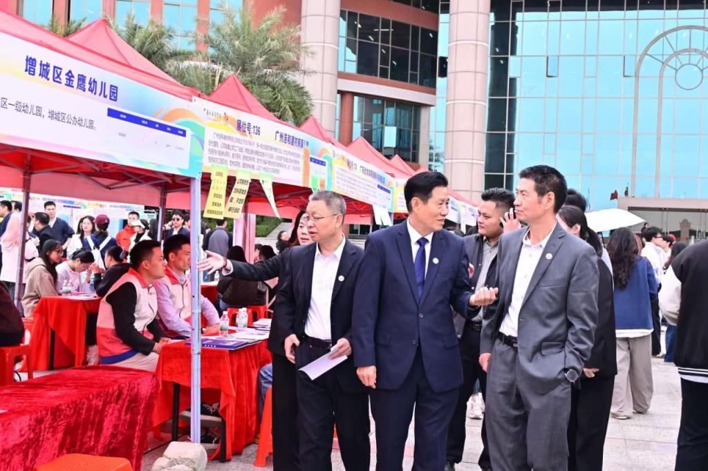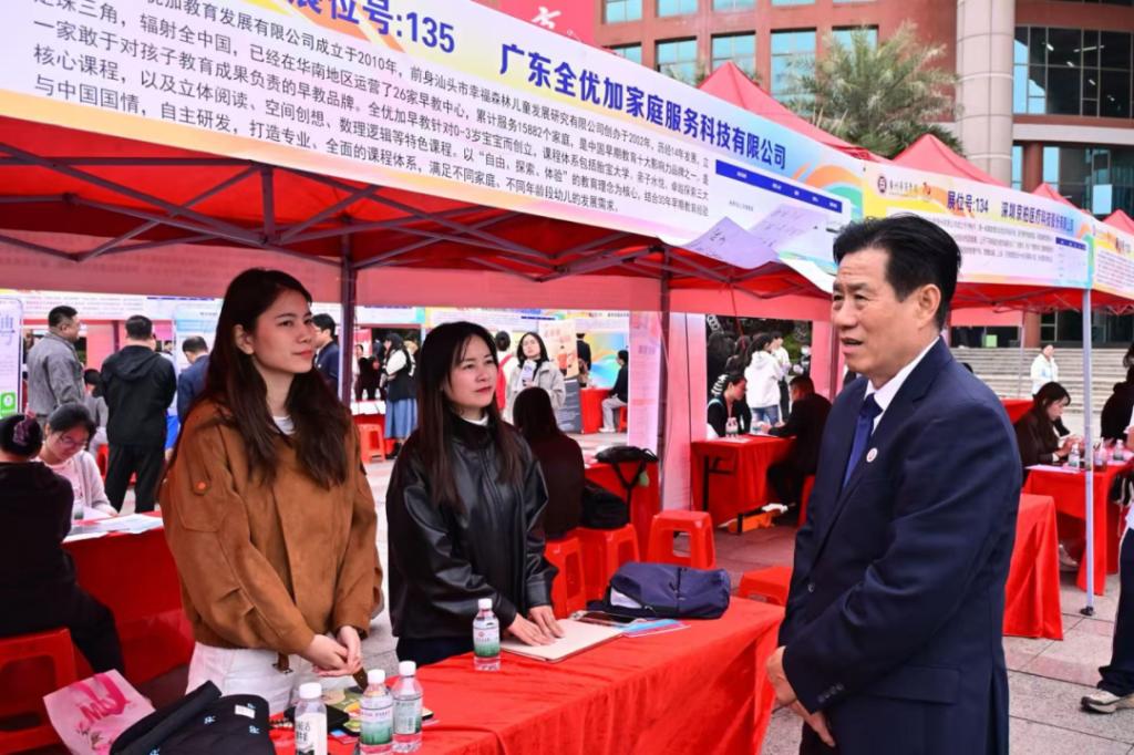 学院领导班子高度重视本次招聘活动,在王金道院长的带领下,学院领导班子、三办负责人及学生辅导员全程参与,深入现场跟进招聘会开展情况。活动期间,尽管天气时有波动,王院长等领导仍多次前往招聘区域,先后走访了广州增城区华商外语实验幼儿园、大参林医药集团股份有限公司等摊位,与企业负责人交流用人需求,同时了解用人单位对学院学生的评价与期待。广州增城区华商外语实验幼儿园负责人提到,此前已有教师教育学院的实习生在园工作,学生们的专业素养与工作表现都很出色,希望后续能与学院建立更稳定的人才输送合作;大参林医药集团相关招聘人员也表示,十分认可学院学生的综合能力,期待有求职意向的同学积极投递简历,加入企业团队。