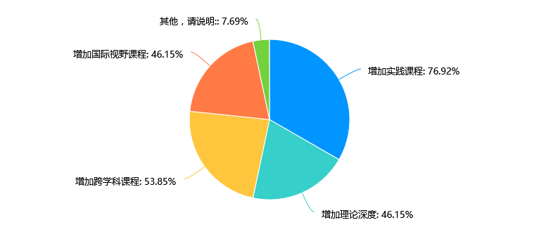 数据表明,超过半数(53.85%)的受访者对本专业的师资力量表示满意,而有30.77%的受访者认为师资力量一般,只有少数人对师资力量不满意或非常不满意。需要进一步提升师资力量的质量,可以加强师资队伍的培训和发展,提高教师的教学水平和专业素养,以更好地满足学生的学习需求。