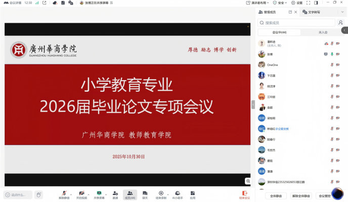 2025年10月30日,教师教育学院小学教育系通过线上会议形式,成功组织召开了2026届毕业论文指导与评审专项工作会议。本次会议旨在进一步规范毕业论文指导流程,明确各项工作要求,确保毕业论文质量,为即将到来的本科教学工作合格评估做好充分准备。 会议由潘昕迪老师主持,教学副院长张博教授主讲,系主任李志厚教授以及全体外聘专家指导教师同参与。 会议伊始,潘昕迪老师代表小学教育系对各位外聘专家在百忙之中参会表...
