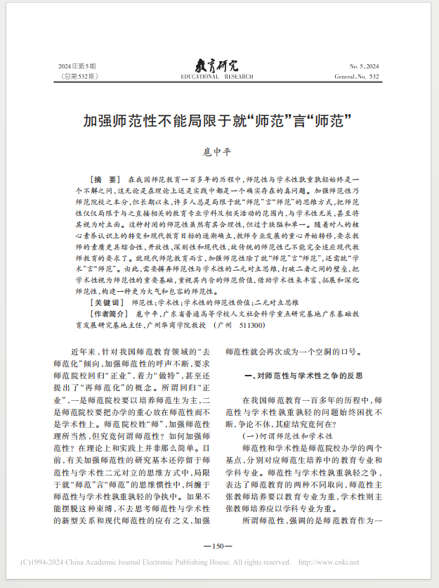 本文由扈中平于2024年5月发表于《教育研究》。摘要:在我国师范教育一百多年的历程中,师范性与学术性孰重孰轻始终是一个不解之问,这无论是在理论上还是实践中都是一个确实存在的真问题。加强师范性乃师范院校之本分,但长期以来,许多人总是局限于就“师范”言“师范”的思维方式,把师范性仅仅局限于与之直接相关的教育专业学科及相关活动的范围内,与学术性无关,甚至将其视为对立面。这种封闭的师范性虽然有其合理性,但过...