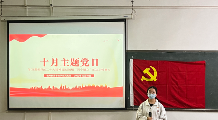 为深入贯彻学习党的二十大精神,激励党员发挥先锋作用,教师教育学院学生党支部于2022年10月31日18:40以线上线下相结合的形式开展“学习贯彻党的二十大精神,深刻领悟‘两个确立’的决定性意义”十月主题党日活动。由教师教育学院学生党支部朱娜书记主讲,江彩蝶同志主持。 第一项议程:贯彻落实党的第一议题制度,学习贯彻党的二十大精神,要做到“五个牢牢把握” 朱娜同志指出,为了贯彻二十大精神,全体党员同志应该做到...