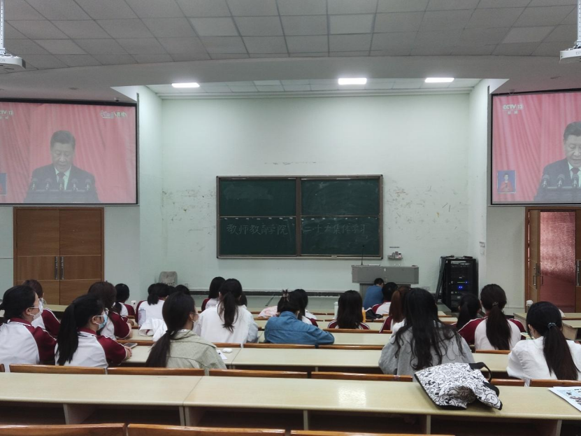 中国共产党第二十次全国代表大会16日上午在人民大会堂开幕。为迎接党的二十大胜利召开,激励广大华商青年永远跟党走、奋进新征程、建功新时代,,教师教育学院于10月16日上午10点组织教师教育学院的党员、团员、学生骨干代表在励志楼A108教室举办中国共产党第二十次全国代表大会开幕式直播观看仪式。 直播开始前,参会人员有序入场。观看直播时,面对着鲜艳的国徽,全体肃立,高声歌唱国歌。会议全程肃静,参会人员全神贯注地倾...