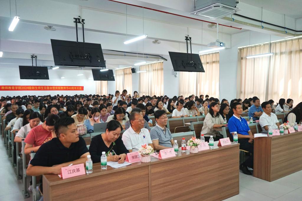 金风送爽,丹桂飘香。在这个满载收获与希望的季节里,教师教育学院 2024 级新生师生见面会暨庆祝教师节 40 周年大会于 2024 年 9 月 10 日在肇庆校区隆重举行。学院全体领导、系部主任、教职工以及 2024 级全体新生齐聚一堂,共同欢庆这个意义非凡的日子。陈上仁副院长介绍了到场的各位学院领导,带领全体师生一同观看了教师教育学院宣传短片。短片如一幅绚丽的画卷,徐徐展开学院的辉煌历程,让大家深刻感受到学院深厚的文化底...